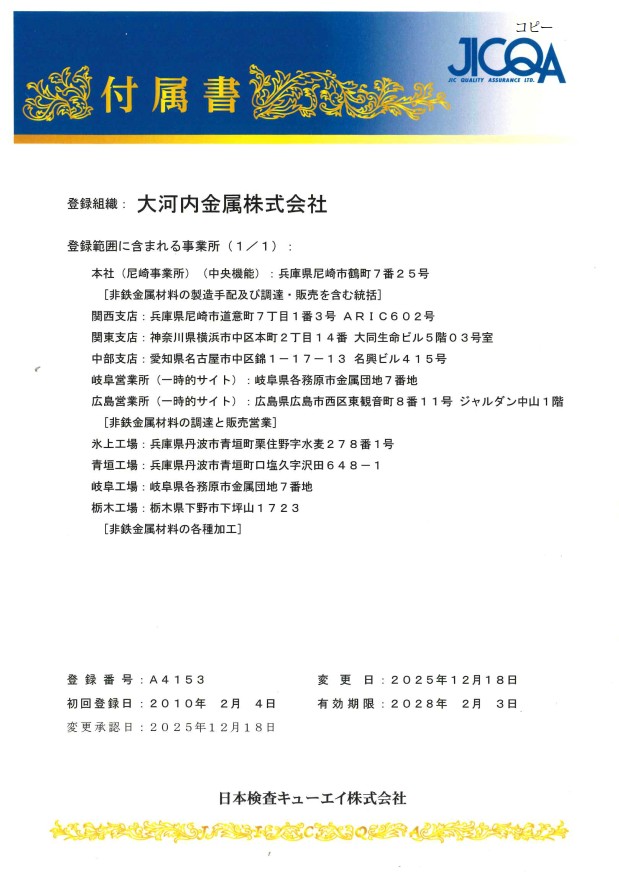 大河内金属は非鉄金属材料において、JISQ9100の認証を取得しました。